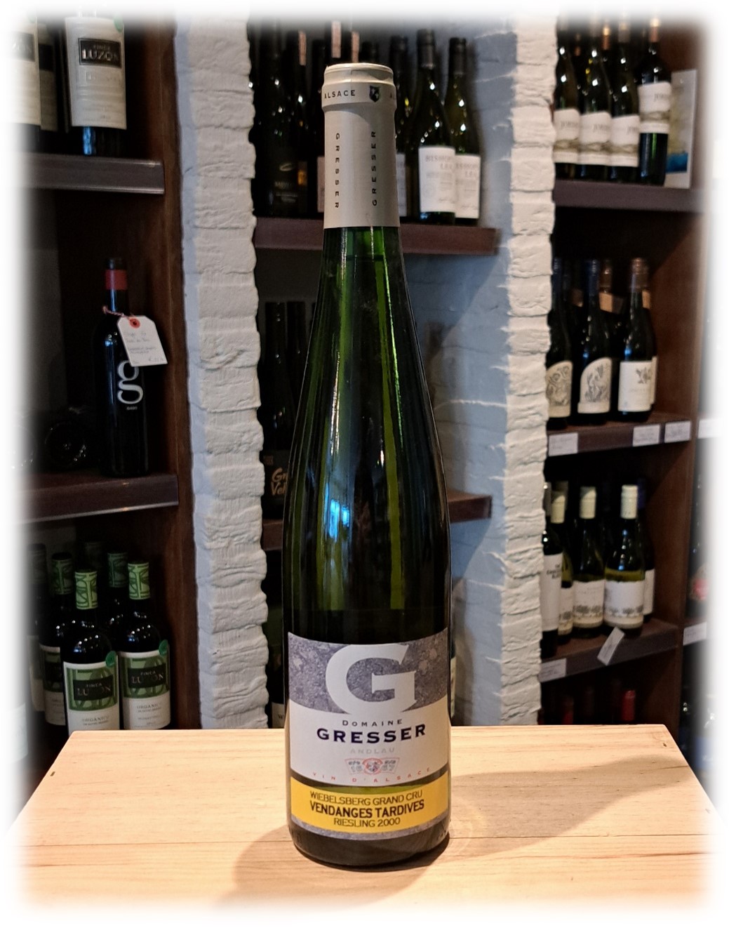 Domaine Gresser Vendange Tardives 2000 to słodkie białe wino z Alsace, pochodzące z późnego zbioru („Vendange Tardive”), co nadaje mu wyjątkową koncentrację aromatów i naturalną słodycz.