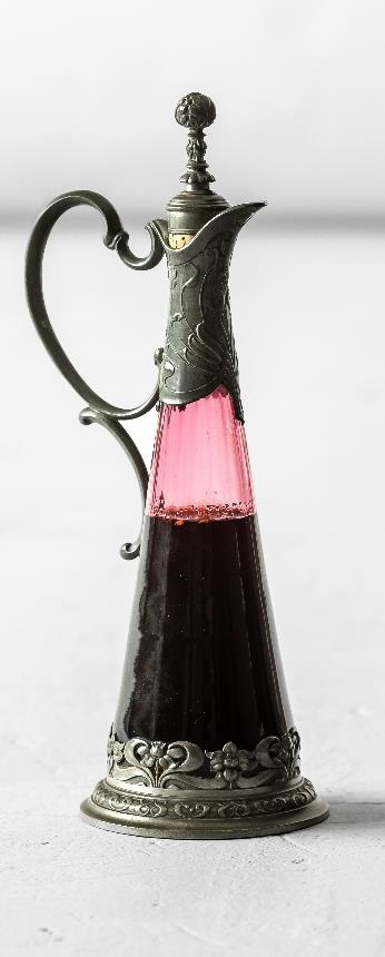 Materiały: Cyna oraz różowe szkło Rok - około 1890 Wysokość - 28 cm Waga - 436 gr W dobrym stanie technicznym