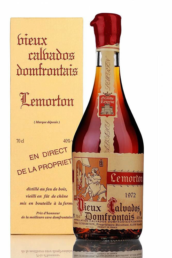 Pojedynczy rocznik calvados z rodziny Lemorton w Mantilly, niedaleko Domfront. Destylowany w 1972 roku calvados dojrzewał przez ponad 40 lat. Rodzina Lemorton używa 60-70% gruszek zmieszanych z jabłkami do produkcji cydru, który następnie dojrzewa w dębowych beczkach przez 11 miesięcy przed destylacją. Ten wysoki udział gruszek ostatecznie tworzy lżejszego, eleganckiego ducha calvados.