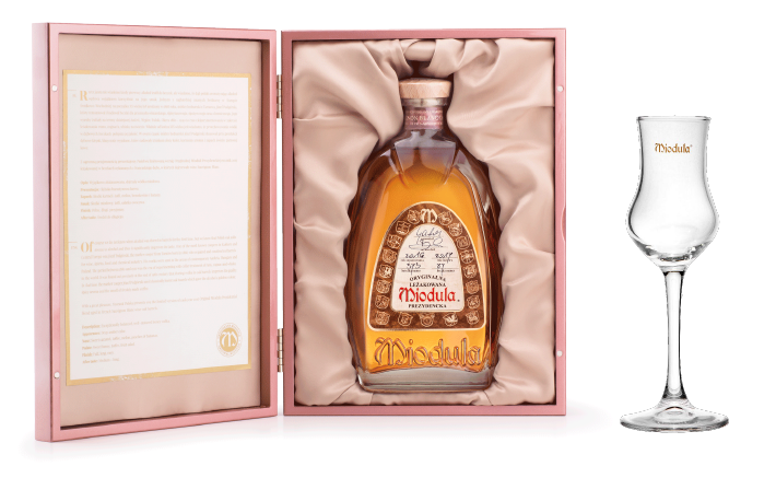 Oryginalna Leżakowana Miodula Prezydencka 0,5L 40% Piano Rose Gold Sauvignon Blanc 2015 oraz zestaw 6 kieliszków do degustacji Miodula