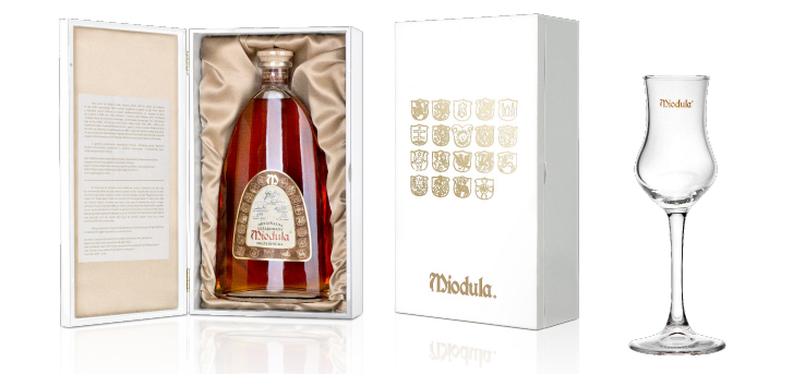 Oryginalna Leżakowana Miodula Prezydencka Box Piano White Homage J. Łaski Tempranillo 1,5L 40% rocznik 2015 oraz zestaw 6 kieliszków do degustacji Miodula