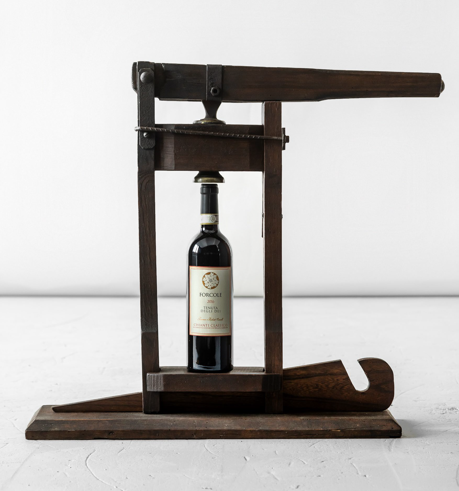 XIX wieczny przyrząd do zamykania butelek, służący włoskiemu producentowi wina z obszaru Emillia Romana. Posiada regulacje w zależności od wysokości butelek w tym dużych butelek. Oryginalny. Ze wzgórz Emilii-Romanii, gdzie były i są produkowane doskonałe wina, takie jak Albana i Sangiovese. Doskonałe wyposażenie producenta wina lub jako przedmiot kolekcjonerski.