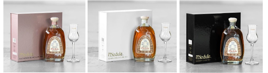 W skład zestawu wchodzą 3 wyjątkowe produkty: Oryginalna Leżakowana Miodula Prezydencka Sauvignon Blanc Cask 2016 0,5L 40% in rose gold, Oryginalna Leżakowana Miodula Prezydencka Tempranillo Cask 2015 0,5L 40% in white oraz Oryginalna Leżakowana Miodula Prezydencka Sherry Cask 2015 0,5L 40% in black
